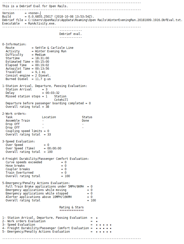 The contents of the file are often self-explanatory, and therefore can be evaluated by the same contents developer. It includes reports of various errors in the MSTS files which are ignored by OR, including missing sound files, unrecognized terms in some files, etc. Selecting the Experimental Option Show shape warnings allows OR to report errors found in shape files in the log file. It includes also reports about malfunctions in the gaming session, such as trains passing red signals, as well as OR malfunctions.
