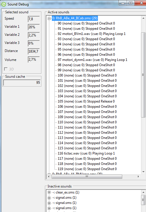 It shows in the upper part the list of all active .sms files (track sound apart); by expanding the detail of a specific .sms file, the list of all sound streams is displayed, as well as their state. On the left the value of the analog sound variables is displayed for the selected .sms file. The volume refers to the first stream of the selected sound file.