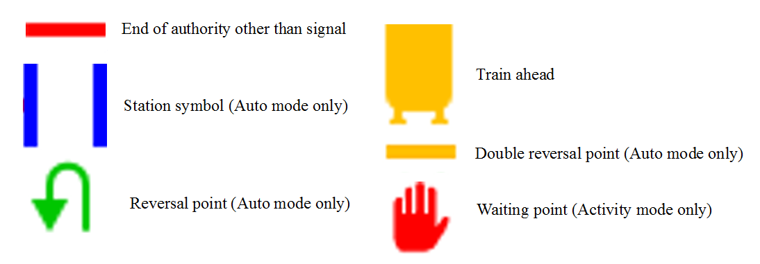 The path shows all track circuit sections which build this train’s path. Track circuit sections are bounded by nodes, signals or cross-overs, or end-of-track. Each section is indicated by its type: