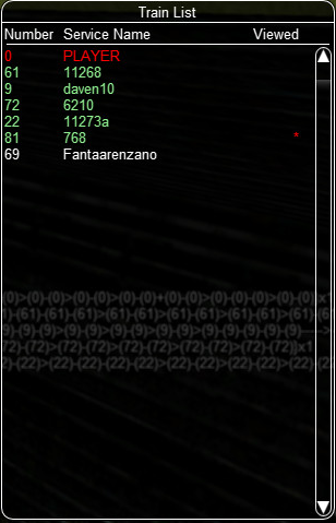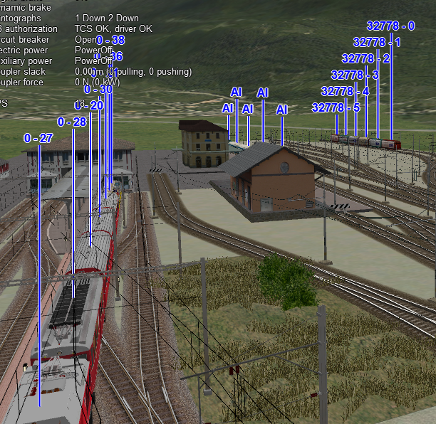 PLAYERstring is displayed.Path: the state of the train’s path. The figure left of the “=” sign is the train’s present subpath counter : a train’s path is split into subpaths when its path contains reversal points. The details between { and } are the actual subpath. Following the final } can be x<N>, this indicates that at the end of this subpath the train will move on to the subpath number N. Path details :