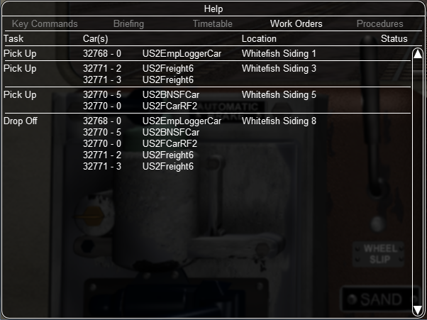 If the locomotive or tender is alongside the pickup point, e.g. a water tank, then the refilling takes place as the key is held down. If the locomotive is further away, then the distance to the nearest pickup is shown instead.